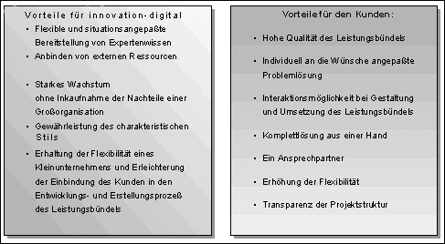 Dadurch entwickelt sich im Zuge vieler Erfahrungen ein strategisches Unternehmenskonzept. . Die Basis stellen die neuesten Entwicklungen in der Informations- und Kommunikationstechnologie dar. Sie verhelfen innovation-digital zu internem Wachstum, ohne dass die Nachteile einer Großorganisation in Kauf genommen werden müssen. |